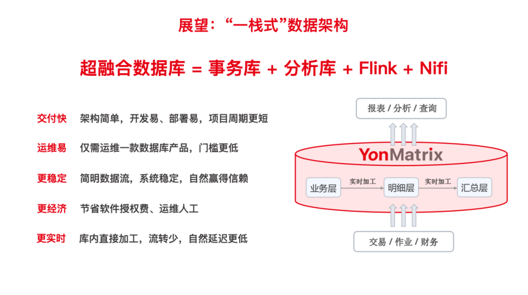 未来,YonMatrix 还将继续以“超融合理念”为原点,基于典型场景深度创新,以“一栈技术,全栈能力”为基石,进一步简化架构,支持用友 BIP 为数智化转型中的企业提供更优秀的产品服务,充分挖掘数据潜力,提升企业竞争力。