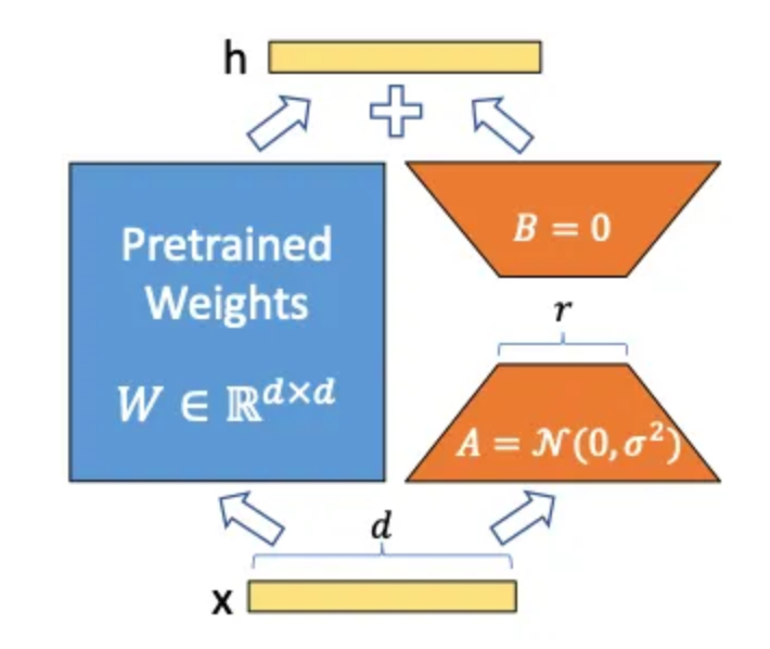 现在我们有了这些新的矩阵和,它们会发生什么呢?将输入馈送给的同时也会提供给,并且的输出会加到原始矩阵W的输出上。也就是说在顶部训练了一些参数,并将它们的输出添加到原始预测中,从而可以影响模型的行为。此时不再对进行训练,这就是为什么我们有时会说被冻结了。重要的是,和的加法不仅仅在最后一层进行(这只会在顶部添加一层),而且可以应用于神经网络中深层的层次。