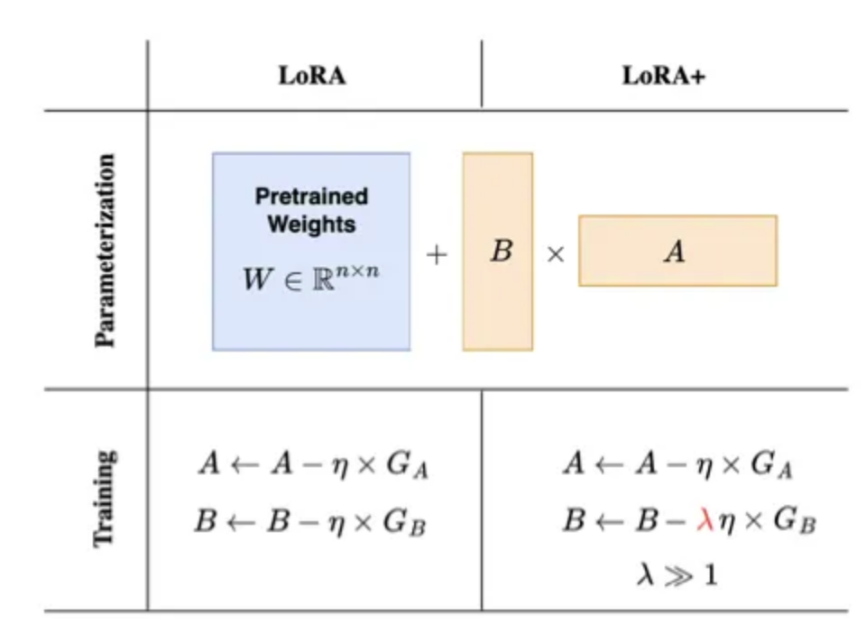 LoRA+ 引入了一种更有效的训练LoRA适配器的方法,通过为矩阵A和B引入不同的学习率。在训练神经网络时,通常只有一个学习率被应用于所有权重矩阵。然而,对于LoRA中使用的适配器矩阵,LoRA+的作者可以证明,拥有单一学习率是次优的。通过将矩阵B的学习率设置得比矩阵A的学习率高得多,训练变得更加高效。