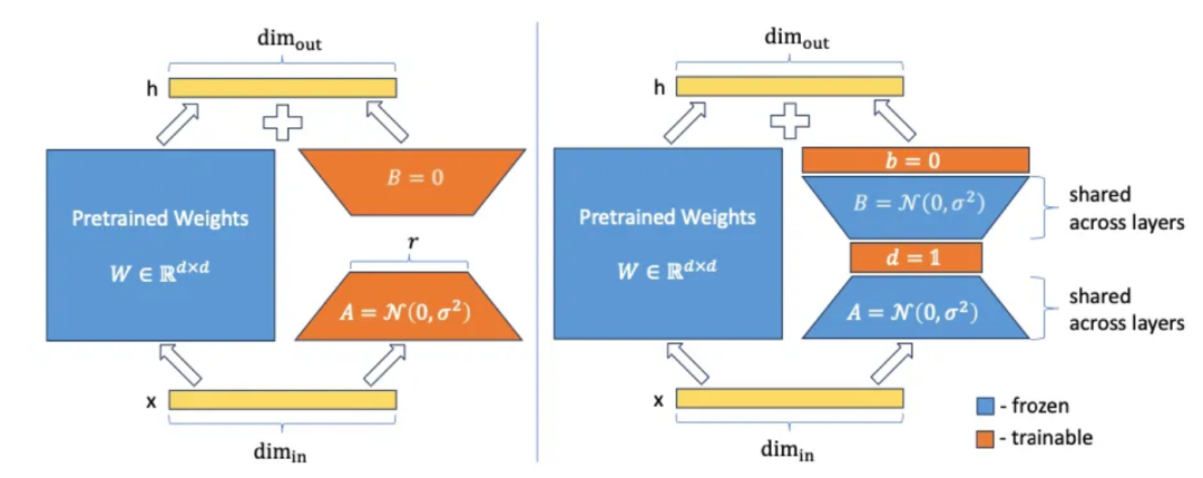 基于这个想法,有一些方法只训练这些相关的子网络。通过在矩阵后添加投影向量,可以获得类似的行为。由于矩阵与向量的乘积,这可能会导致与调整矩阵中的一些稀疏参数相同的输出。这正是VeRA的作者通过引入向量和所提出的,这些向量是经过训练的,而矩阵和是冻结的。此外,与原始的LoRa方法相比,矩阵B不再被设置为零,而是像矩阵A一样随机初始化。