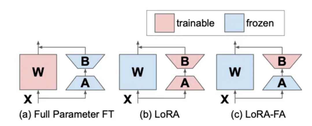 LoRA-FA代表的是带有Frozen-A的LoRA,它与VeRA的方向类似。在LoRA-FA中,矩阵A在初始化后被冻结,因此作为一个随机投影。不过,与添加新向量不同,矩阵B在初始化为零后进行训练(就像在原始的LoRA中一样)。这样可以减少一半的参数数量,同时性能与普通的LoRA相当。