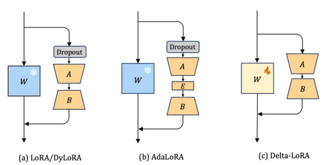 Delta-LoRA: Zi, B., Qi, X., Wang, L., Wang, J., Wong, K. F., & Zhang, L. (2023). Delta-lora: Fine-tuning high-rank parameters with the delta of low-rank matrices. arXiv preprint arXiv:2309.02411.