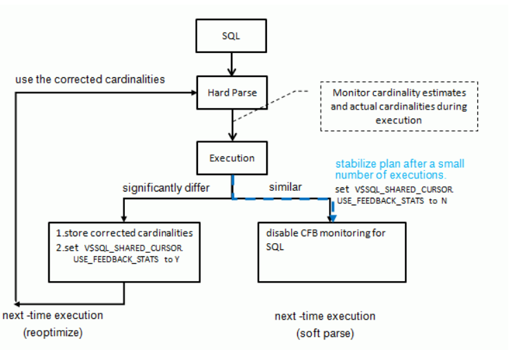 即使统计数据被尽可能准确地计算,估计的基数可能也是不准确的。在第一次执行 SQL 语句时,会生成一个执行计划。在计划优化期间,会注意到某些类型的估算,并监视生成的游标。执行完成后,计划中的一些基数估算会与执行期间实际观察到的基数进行比较。如果发现这些估算与实际基数存在显著差异,则会存储更正后的基数以供以后使用。下次执行查询时,将再次对其进行优化(硬解析),而这次优化器将使用这些更正后的估算值来替代之前使用的原始估算值。基于更准确的统计数据可能会创建不同的计划。