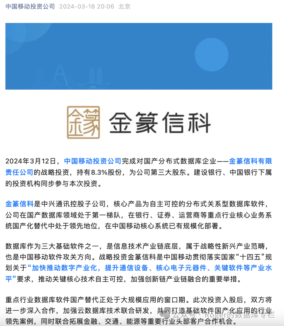 在中国移动各省子公司,实际上都陆续上线了一些GoldenDB分布式,这样难怪中国移动要战略入股了。