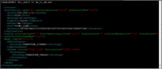 切换到/home/dmdba/dts_cmd 目录下,命令是:cd /home/dmdba/dts_cmd,vi dm_to_dm.xml,拷贝源代码到这个文件并保存。