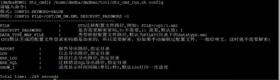 (2)查看dts_cmd_run.sh脚本使用帮助,命令是:/home/dmdba/dmdbms/tool/dts_cmd_run.sh config