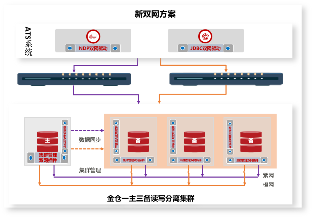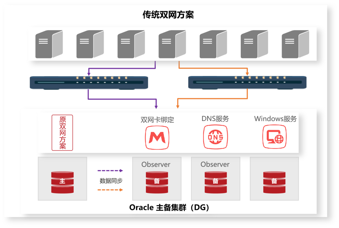 但是传统双网方案有诸多外部环境要求,比较典型的如:双网卡绑定需要交换设备、域名到多个IP的映射需要DNS服务器、Windows服务要求数据库集群必须部署在Windows端,传统双网方案与IT环境紧耦合,依赖操作系统协议转换,在任意一个网络异常的情况下,网卡切换都会存在性能损耗,导致业务切换体验差,后期通用性差、运维困难。