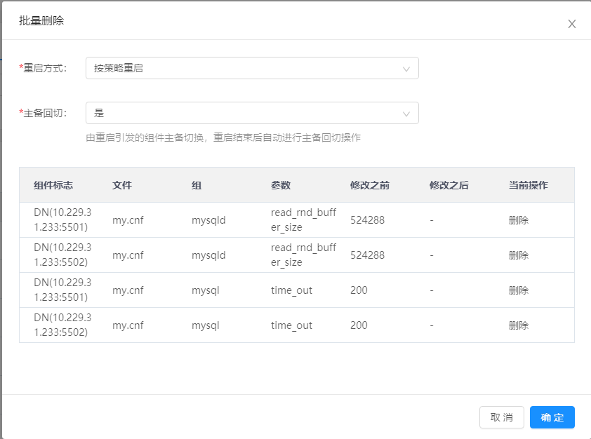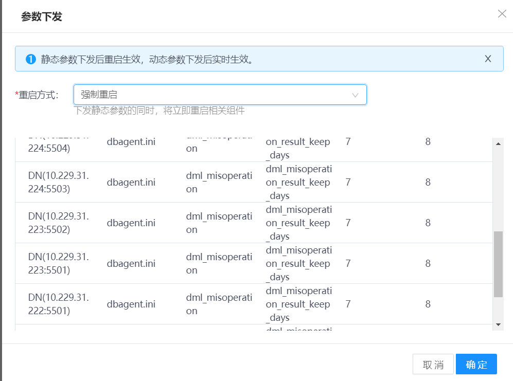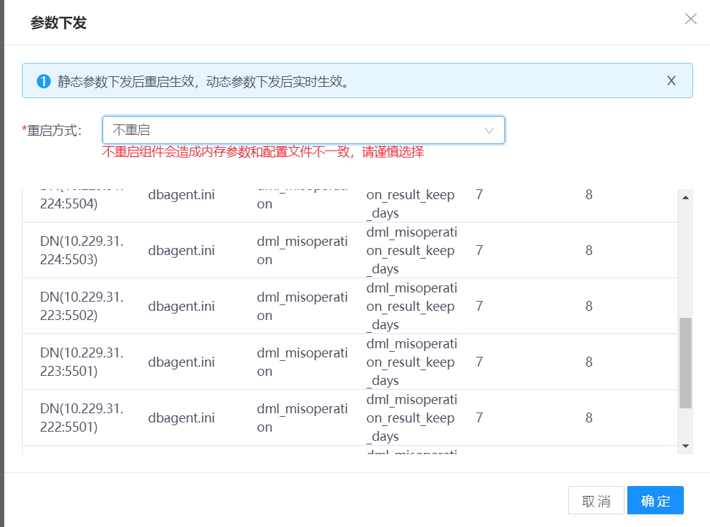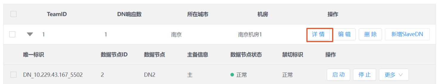 重启DN | 1)在待管理DN行,单击更多,选择重启,弹出操作确认窗口。 2)单击确认按钮,重启DN。 |