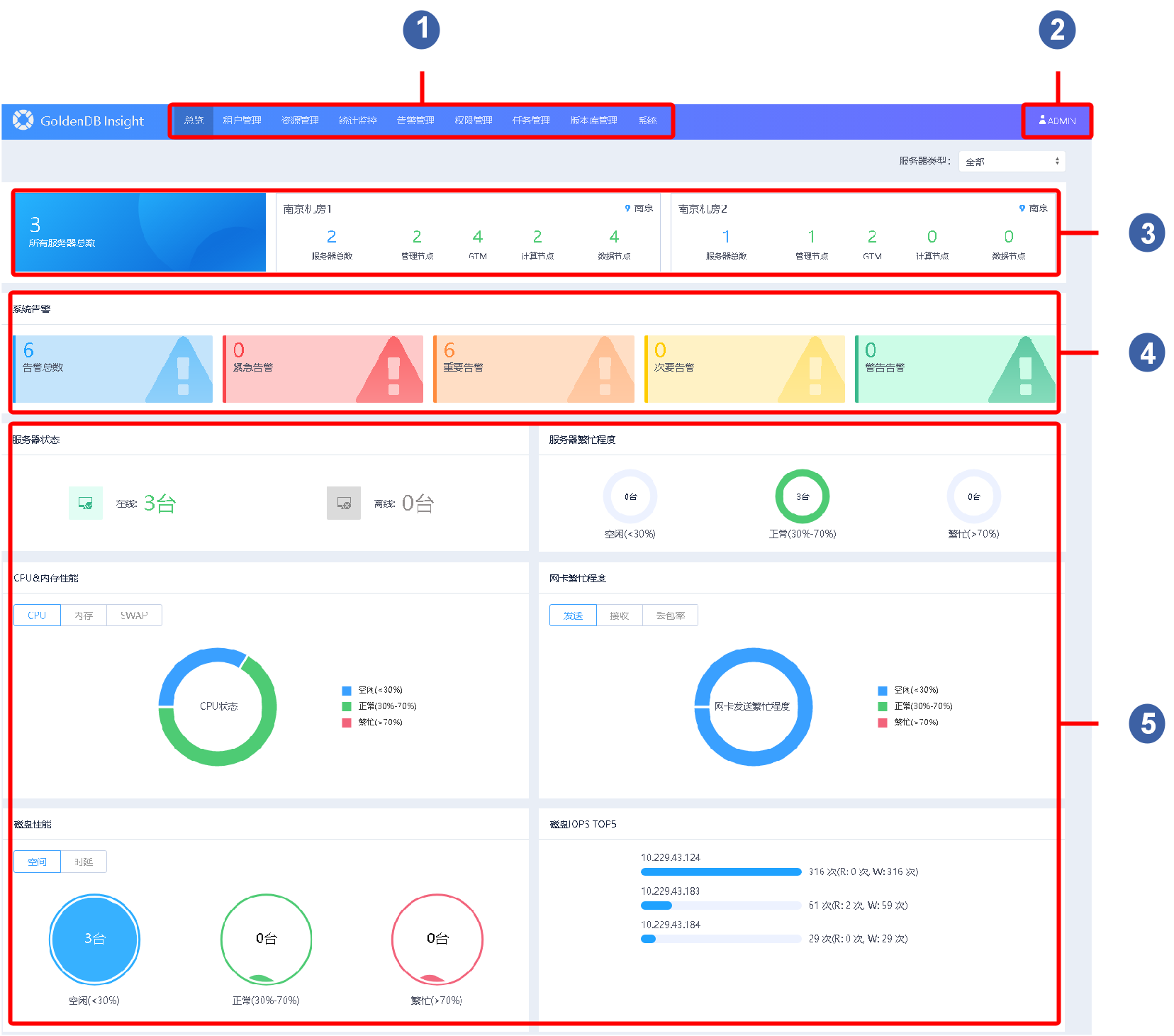 3 | 机房总览区域 | 展示GoldenDB数据库在各地机房的服务器、管理节点、计算节点以及数据节点数量 |