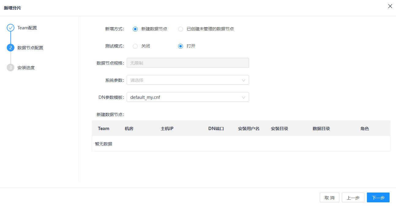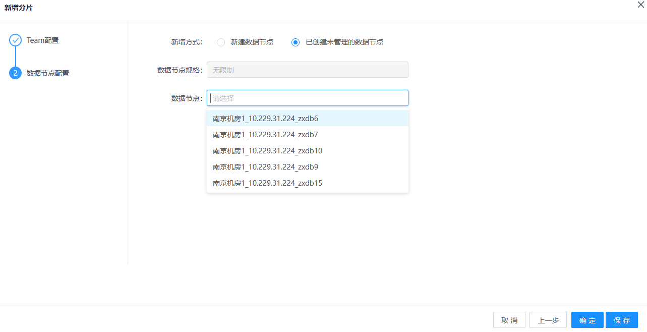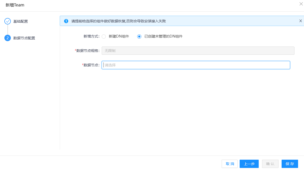 在分片层新增DN组件,新增DN支持新建DN组件或使用已创建未管理的DN组件。