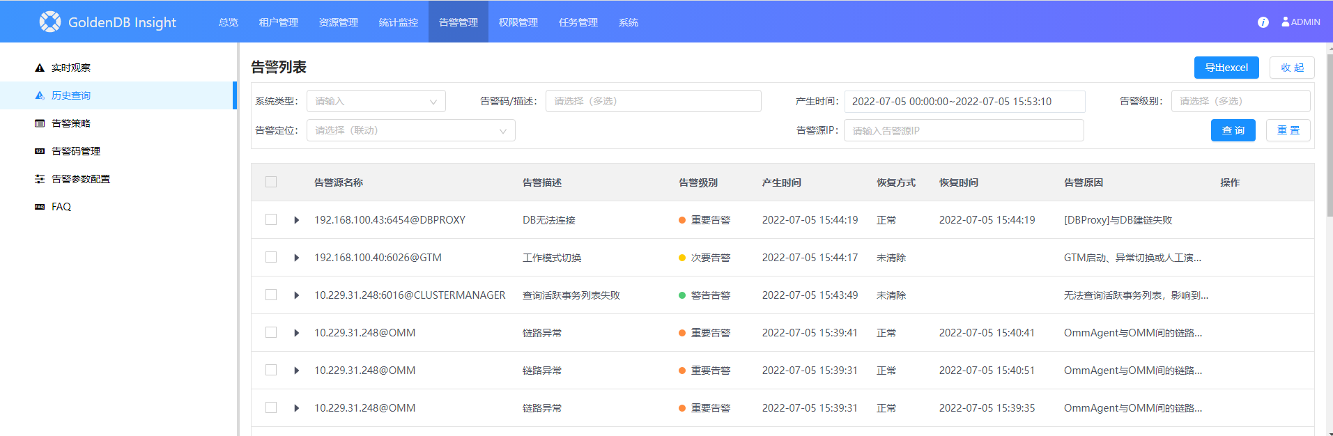 4.单击导出excel按钮,可以将查询的告警信息保存到本地Excel中。