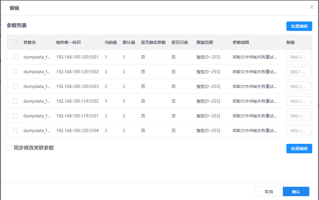 配置页面显示了该组件配置文件名以及具体配置项对应的参数值,当参数发生变动后后,对应变更信息可以在配置变更历史查看到。