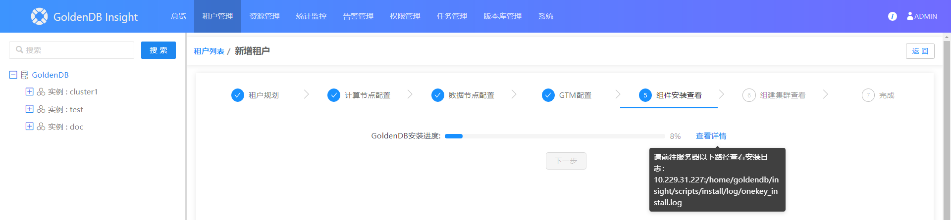 10.组建集群完成后,即新增租户成功,左侧树结构将显示新建的租户信息。
