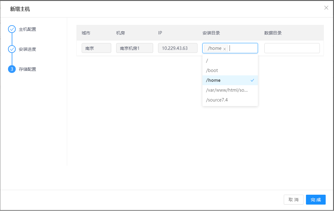4.主机代理安装完毕后,单击下一步按钮,进入存储配置界面。