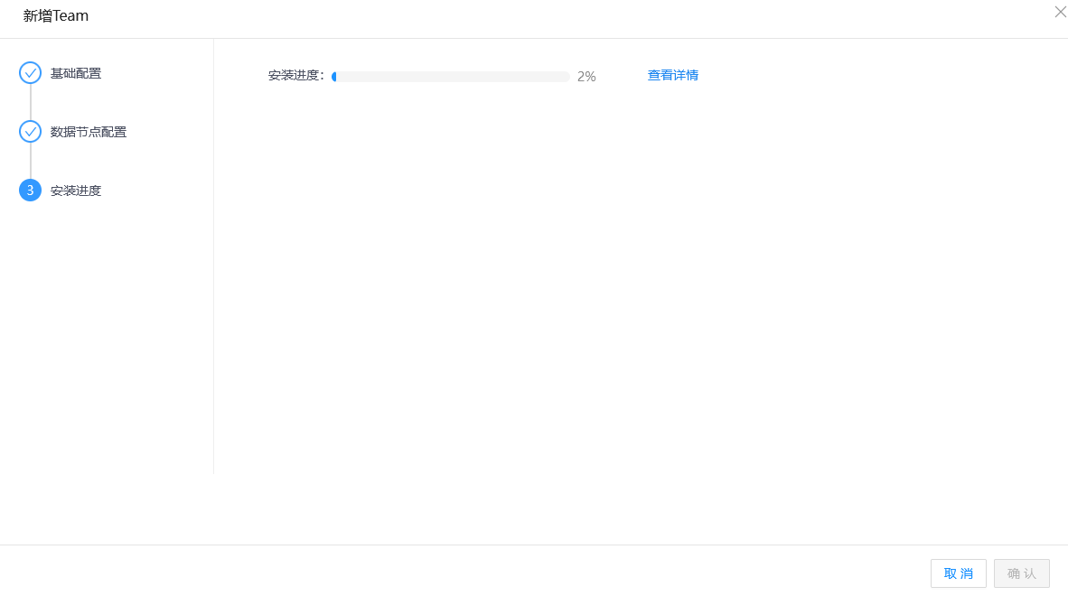 该过程可以通过进度条查看组件安装进程,单击查看详情按钮,可以查看具体信息。组建集群失败,可单击重试按钮,进行再次组建。