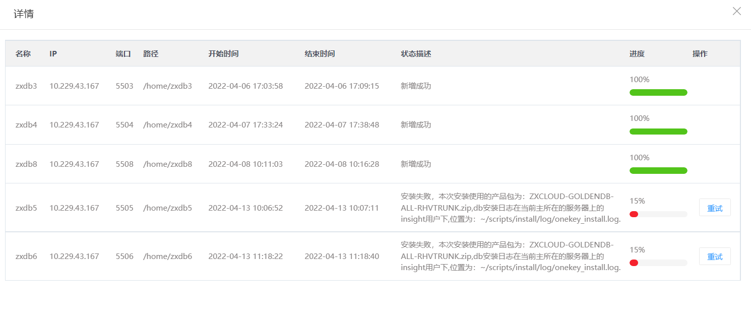 6.单击详情按钮,查看新增DN的进度,失败的任务可以点击重试按钮进行重试。
