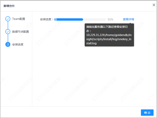 该过程可以通过进度条查看组件安装进程,鼠标置于查看详情页时,可以显示安装日志的服务器路径。若安装组件失败,可以单击重试按钮进行重试。