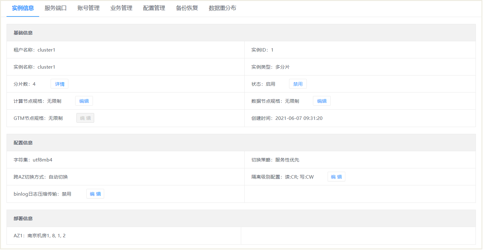 实例类型 | 分为单分片与多分片,多分片类型后期可进行新增分片操作,而单分片不支持 | - |