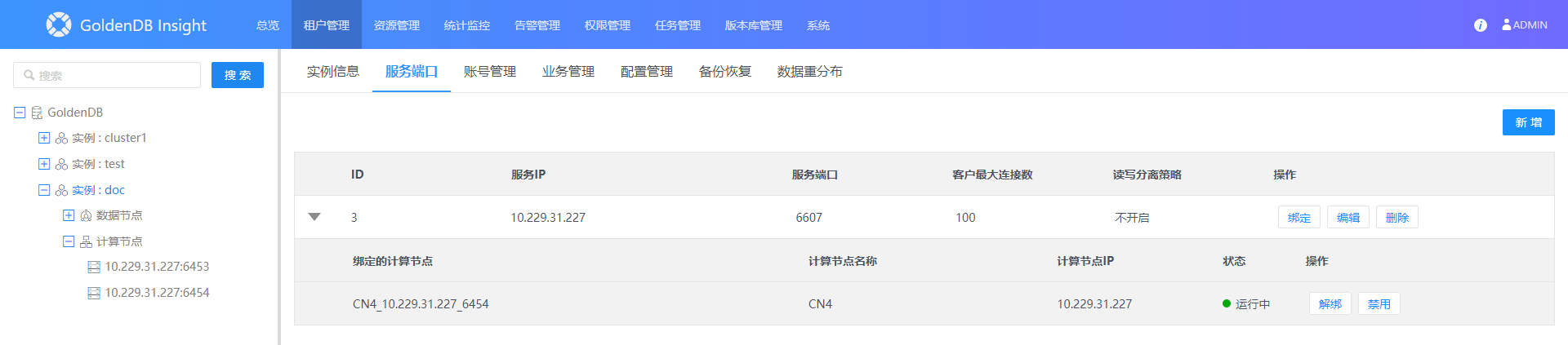 如果是未绑定的CN,选择[租户管理-对应实例]进入服务端口页面,在对应行点击绑定,选择目标CN后确认,自动会启用。