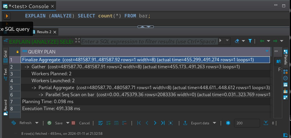 使用DBeaver,我可以使用 EXPLAIN (ANALYZE) 来验证执行器是否实际启动了并行工作进程: