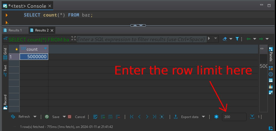 谜题的最后一部分是找出如何在DBeaver中配置行数限制。在文档中进行了一些调查后,我发现答案就在我查看“数据编辑器”窗格时就在眼前: