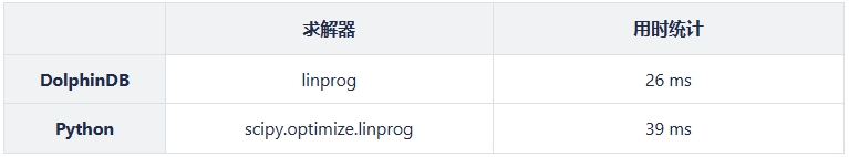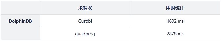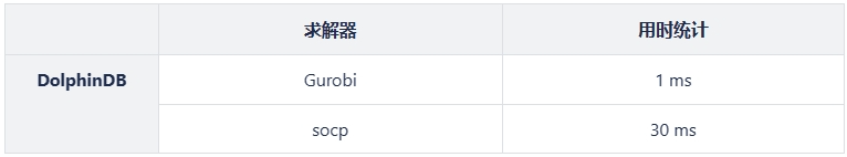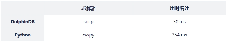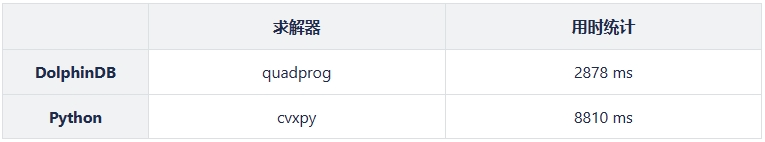 实验证明,DolphinDB 最优化函数求解的结果与 Python 的求解结果在小数点后至少四位内均达到一致,同时 DolphinDB 的最优化函数求解效率相较 Python 均有较为显著的提升。