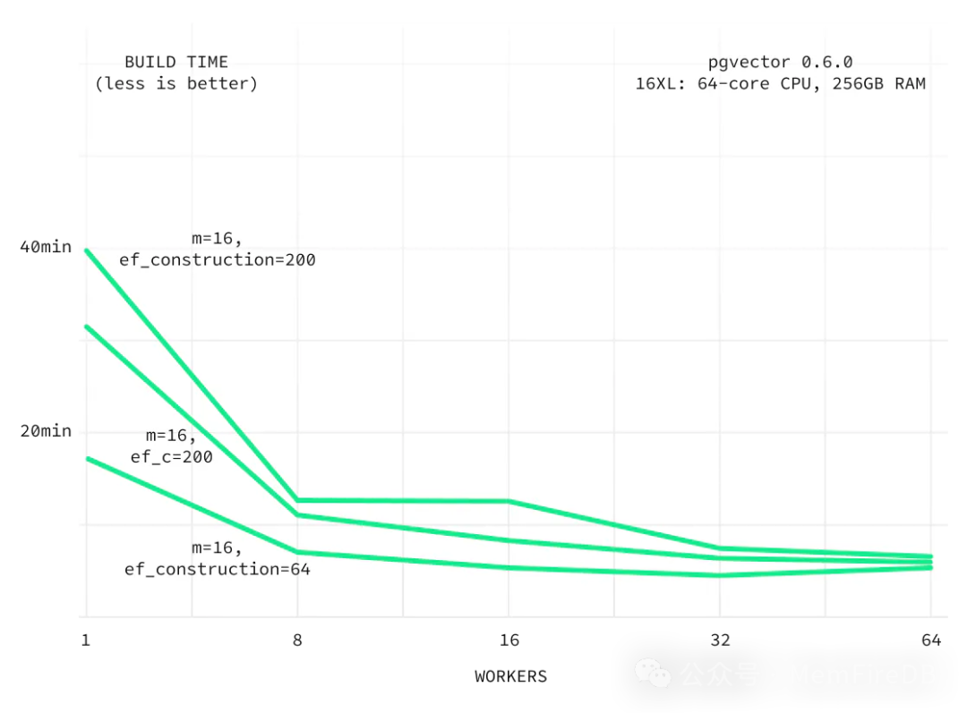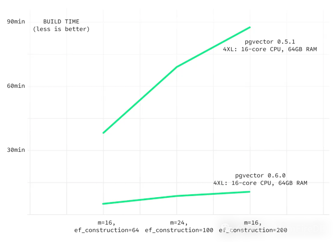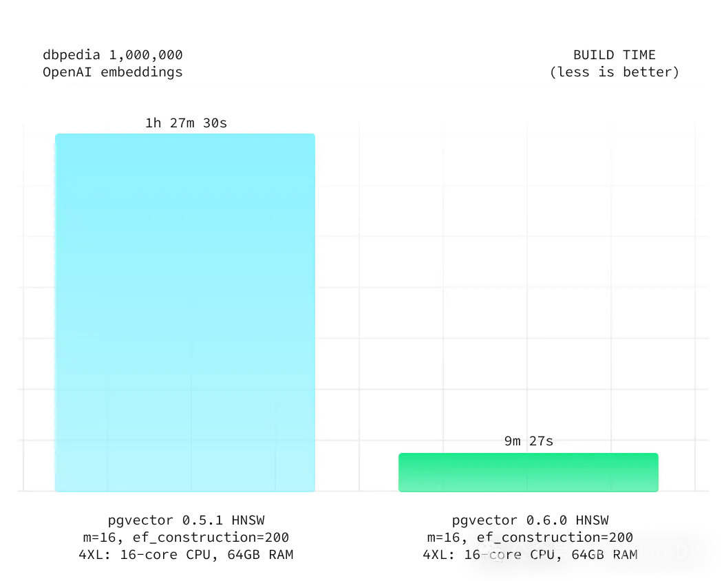 在0.6.0版本之前,pgvector只支持使用单线程构建索引——这对大型数据集来说是一个很大的瓶颈。例如,为1536个维度的100万个向量建立索引大约需要1小时27分钟(使用'm'=16, 'ef_construction'=200