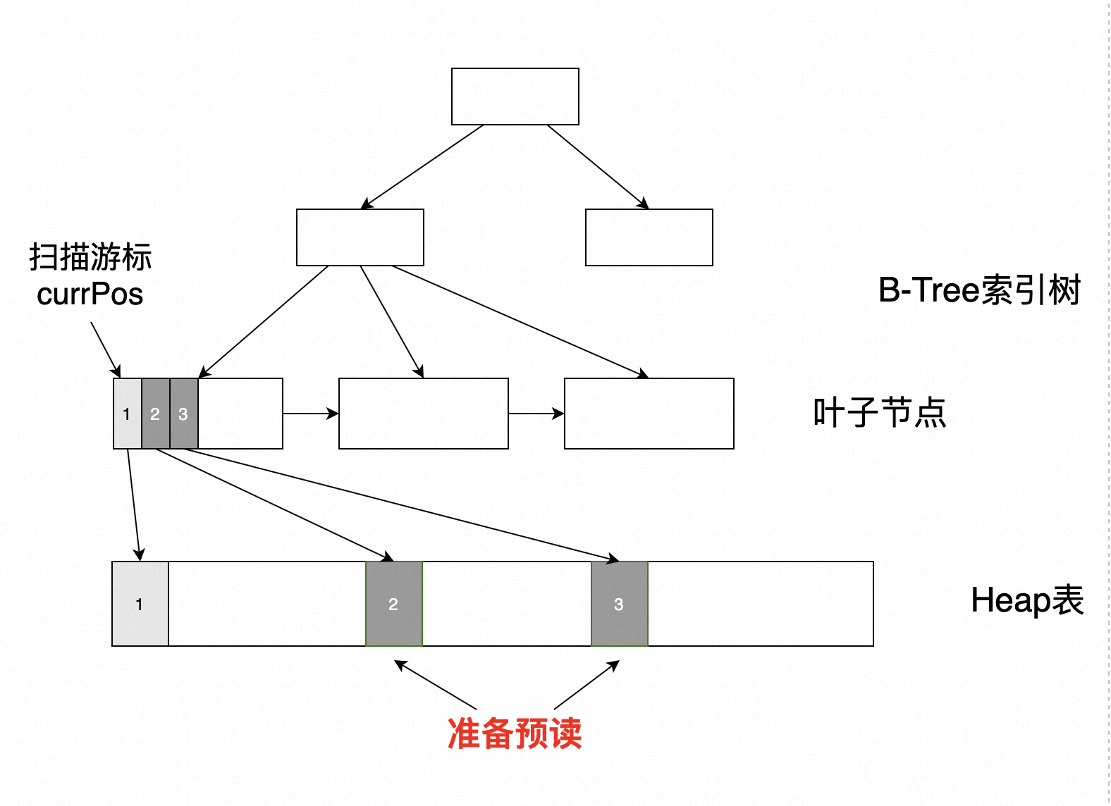 如下图所示,在索引扫描的算法中,在读取到索引树的叶子页面,通过叶子页面能够得到多个指向Heap表的行指针,从行指针中提取出接下来要读取的Heap表页面号,并逐个通过异步IO提前预读。