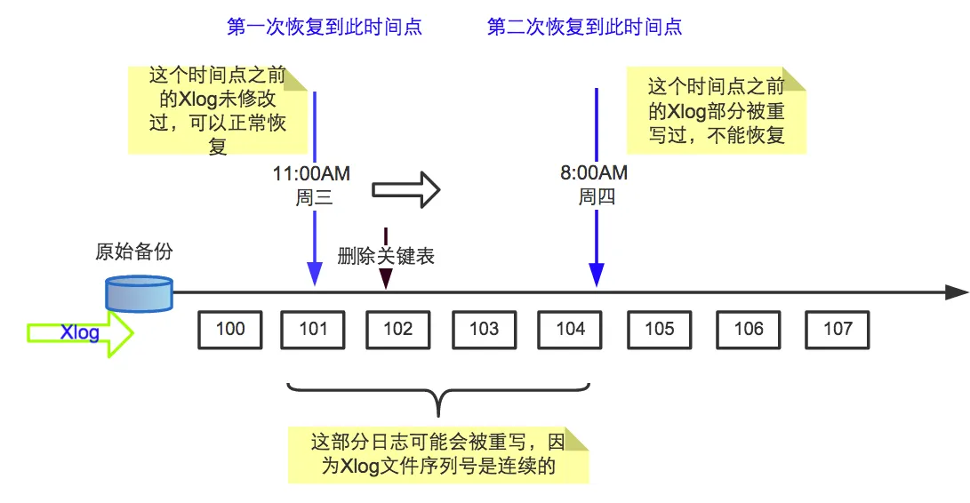 为了理解引入时间线的背景,我们来分析一下,如果没有时间线,会有什么问题?先举个将数据库恢复到以前时间点的例子。假设在一个数据库的运行过程中,DBA在周三12:00AM删掉了一个关键的表,但是直到周五中午才发现这个问题。这个时候DBA拿出最初的数据库备份,加上存在归档目录的日志文件,将数据库恢复到周三11:00AM的时间点,这样就能正常启动和运行。但是,DBA后来意识到这样恢复是不对的,想恢复到周四8:00AM的数据。这时会发现无法做到:因为在数据库不断运行中,会产生与旧的WAL文件重名的文件,这些文件进入归档目录时,会覆盖原来的旧日志,导致恢复数据库需要的WAL文件丢失。为了避免这种情况,需要区分原始数据库历史生成的WAL文件和完成恢复之后继续运行产生的(重名的)新WAL文件。整个过程如图1所示: