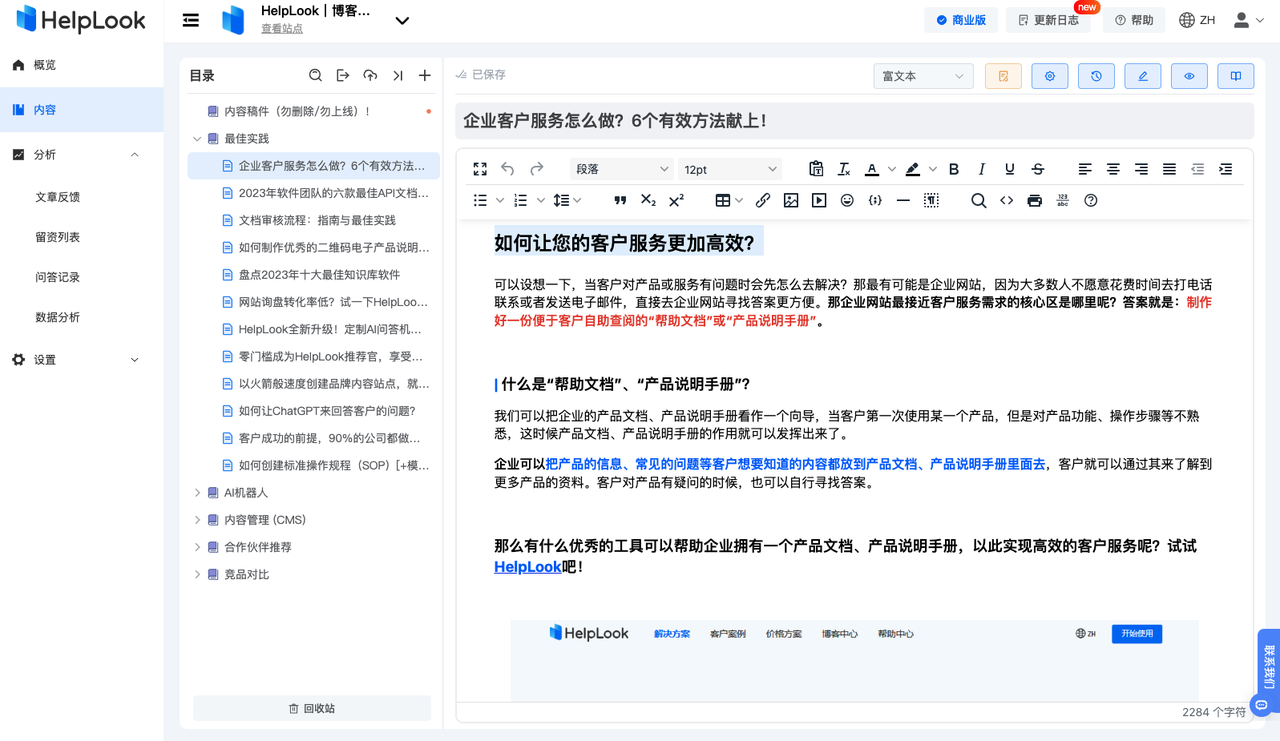 HelpLook可通过几个简单的步骤创建、编辑和发布内部或外部文档。其用户友好的界面和强大的文本编辑器,让你可以快速地创建出看起来专业且内容丰富的文档。