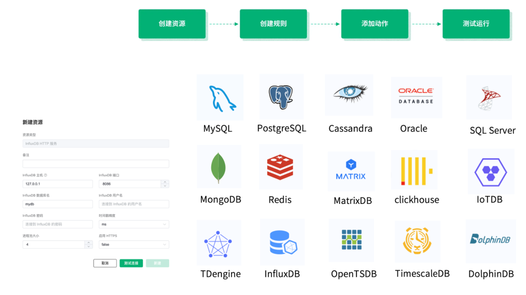 数据处理:NeuronEX 包含100+内置函数,支持数据过滤、数据操作、设备控制以及数据持久化,将数据存储于时序数据库中。