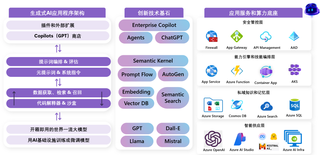 ⇲ 智能供应层:“Azure OpenAI”、“Azure AI Studio”和“Azure AI Infra”突显出 Azure 的人工智能服务和基础设施的集成,确保智能层的稳健性和可扩展性。
