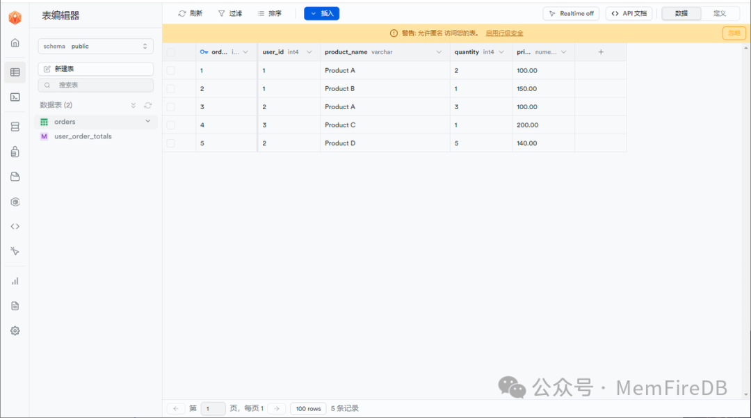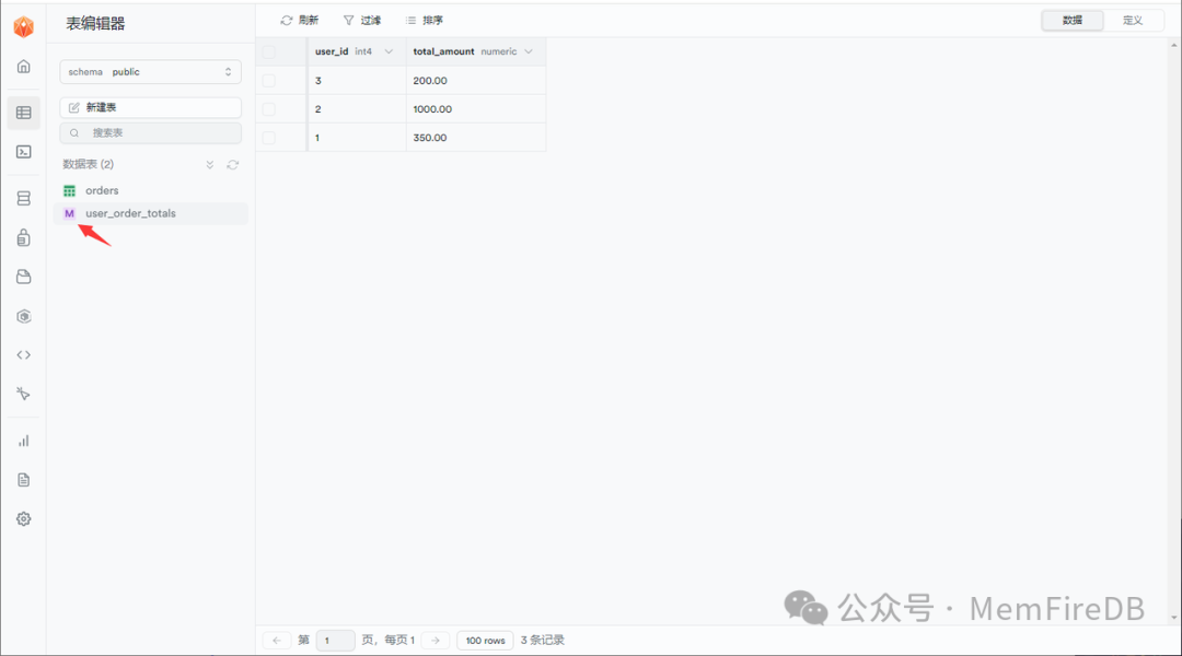接下来,我们创建一个物化视图来汇总每个用户的订单总金额,我们可以使用如下SQL语句来创建物化视图。