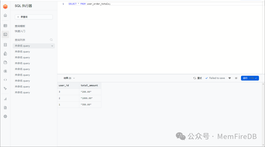现在,我们可以直接查询物化视图来获取每个用户的消费金额,而无需执行复杂的聚合查询: