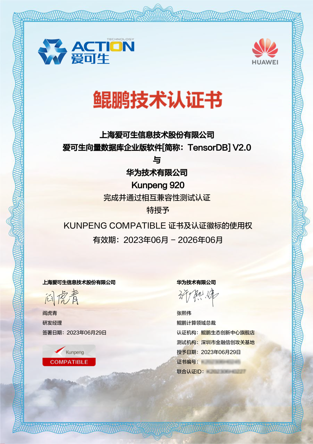 爱可生云树®向量数据库软件 TensorDB 获得华为鲲鹏技术认证