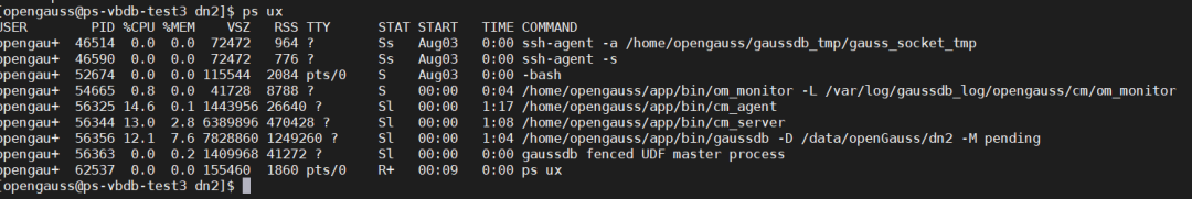 gs_ctl stop -D /data/openGauss/dn2[2023-08-04 22:57:36.610][197800][][gs_ctl]: gs_ctl stopped ,datadir is /data/openGauss/dn2waiting for server to shut down.... doneserver stopped[opengauss@test2 dn2]$ ps uxUSER PID %CPU %MEM VSZ RSS TTY STAT START TIME COMMANDopengau+ 46514 0.0 0.0 72472 964 ? Ss Aug03 0:00 ssh-agent -a /home/opengauss/gaussdb_tmp/gauss_socket_tmpopengau+ 46590 0.0 0.0 72472 776 ? Ss Aug03 0:00 ssh-agent -sopengau+ 52674 0.0 0.0 115544 2116 pts/0 S Aug03 0:00 -bashopengau+ 54665 0.7 0.0 41728 8796 ? S 00:00 10:45 /home/opengauss/app/bin/om_monitor -L /var/log/gaussdb_log/opengauss/cm/om_monitoropengau+ 193209 13.8 0.1 1443956 26632 ? Sl 22:54 0:23 /home/opengauss/app/bin/cm_agentopengau+ 193227 11.9 2.5 6325664 415728 ? Sl 22:54 0:20 /home/opengauss/app/bin/cm_serveropengau+ 193247 0.0 0.2 1409968 41264 ? Sl 22:54 0:00 gaussdb fenced UDF master processopengau+ 197815 0.0 0.2 1344972 33648 ? Sl 22:57 0:00 /home/opengauss/app/bin/gaussdb -D /data/openGauss/dn2 -M pendingopengau+ 197826 0.0 0.0 1196260 15560 ? R 22:57 0:00 /home/opengauss/app/bin/gaussdb -Vopengau+ 197827 0.0 0.0 155460 1860 pts/0 R+ 22:57 0:00 ps ux