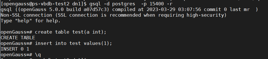 gs_ctl switchover -D /data/openGauss/dn2[2023-08-04 22:26:43.517][171430][][gs_ctl]: gs_ctl switchover ,datadir is /data/openGauss/dn2[2023-08-04 22:26:43.517][171430][][gs_ctl]: switchover term (1)[2023-08-04 22:26:43.525][171430][][gs_ctl]: waiting for server to switchover........[2023-08-04 22:26:48.567][171430][][gs_ctl]: done[2023-08-04 22:26:48.567][171430][][gs_ctl]: switchover completed (/data/openGauss/dn2)[opengauss@test2 dn2]$ gs_ctl status --detailgs_ctl: unrecognized option '--detail'Try "gs_ctl --help" for more information.[opengauss@test2 dn2]$ ps uxUSER PID %CPU %MEM VSZ RSS TTY STAT START TIME COMMANDopengau+ 46514 0.0 0.0 72472 964 ? Ss Aug03 0:00 ssh-agent -a /home/opengauss/gaussdb_tmp/gauss_socket_tmpopengau+ 46590 0.0 0.0 72472 776 ? Ss Aug03 0:00 ssh-agent -sopengau+ 52674 0.0 0.0 115544 2084 pts/0 S Aug03 0:00 -bashopengau+ 54665 0.7 0.0 41728 8796 ? S 00:00 10:31 /home/opengauss/app/bin/om_monitor -L /var/log/gaussdb_log/opengauss/cm/om_monitoropengau+ 167866 13.8 0.1 1443960 26636 ? Sl 22:21 0:48 /home/opengauss/app/bin/cm_agentopengau+ 167884 11.8 2.5 6260128 415892 ? Sl 22:21 0:41 /home/opengauss/app/bin/cm_serveropengau+ 167897 11.6 7.7 7869340 1265916 ? Sl 22:21 0:41 /home/opengauss/app/bin/gaussdb -D /data/openGauss/dn2 -M pendingopengau+ 167904 0.0 0.2 1409968 41244 ? Sl 22:21 0:00 gaussdb fenced UDF master processopengau+ 171967 0.0 0.0 155460 1860 pts/0 R+ 22:27 0:00 ps ux[opengauss@test2 dn2]$ gsql -d postgres -p 15400 -rgsql ((openGauss 5.0.0 build a07d57c3) compiled at 2023-03-29 03:07:56 commit 0 last mr )Non-SSL connection (SSL connection is recommended when requiring high-security)Type "help" for help.openGauss=# \d+List of relationsSchema | Name | Type | Owner | Size | Storage | Description--------+------+-------+-----------+------------+----------------------------------+-------------public | test | table | opengauss | 8192 bytes | {orientation=row,compression=no} |(1 row)openGauss=# insert into test values(1);INSERT 0 1openGauss=#