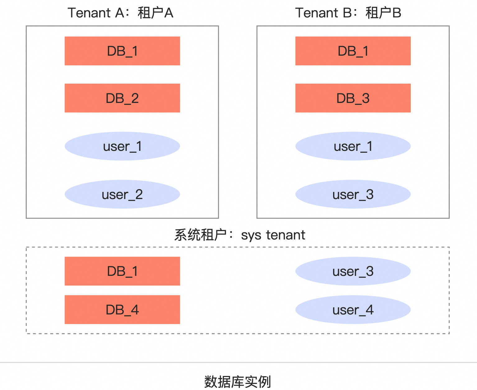 系统租户:系统租户是为了适配原有模式下用户的使用,原有数据库实例中的用户默认属于系统租户,也可以称为系统用户。当通过系统租户下的用户连接数据库时,若该用户拥有对应的数据库实例访问权限,即可访问所有租户下的数据库实例。