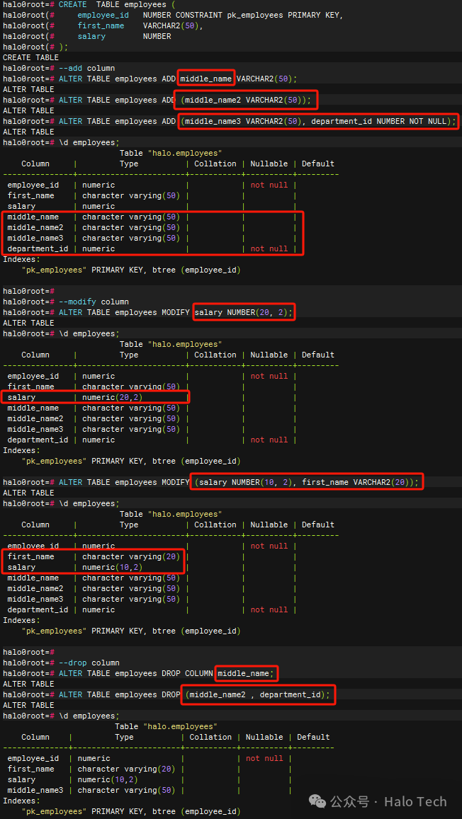 4. ALTER TABLE 兼容Oracle数据库对列操作的方式,如下分别为未增强前Halo数据库列操作写法,以及增强后其现有写法的展示。