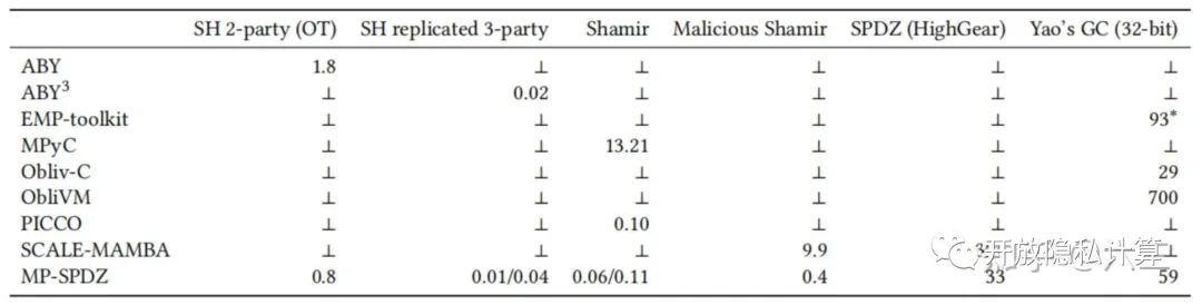15. TinyGarble - 这个框架只实现了Yao的半诚实安全的混淆乱码电路[SHS+15]。Hastings等人无法在这个框架中运行他们所有的例子。