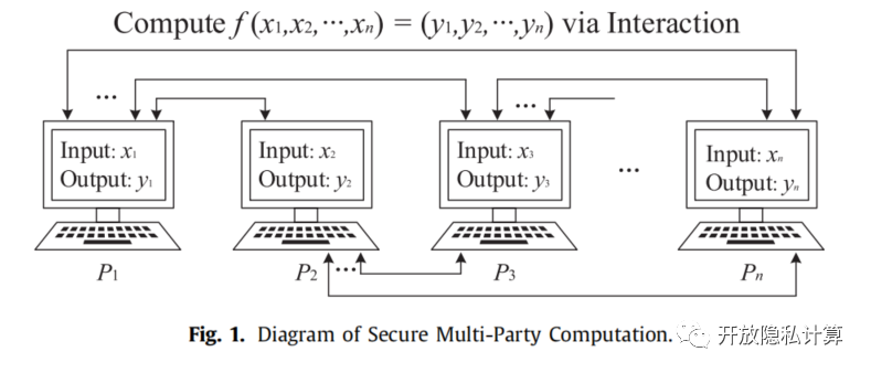 . 如图1所示,一旦计算完成,每一个参与者应该能够获取与之相对应的且不包含其他信息的输出。多方安全计算目的是构建一个安全协议,这个安全协议能允许多个互不信任的参与者在自己隐私输入上联合计算目标函数,同时确保输出的准确,甚至在面对不诚实行为时,能够保护和管控自己的隐私输入。在20世纪80年代,多方安全计算第一次被姚期智院士提出。在过去的30年里,一系列的理论和实践研究工作对多方安全计算进行了深入的研究。