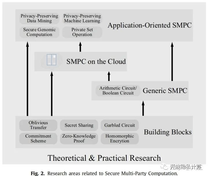 SMPC从理论到实践涵盖了广泛的研究领域,其中包括多方安全计算的构造块,多方安全计算协议,基于云的多方安全计算,以及面向应用的协议等。图2显示了SMPC研究领域的高级概述。