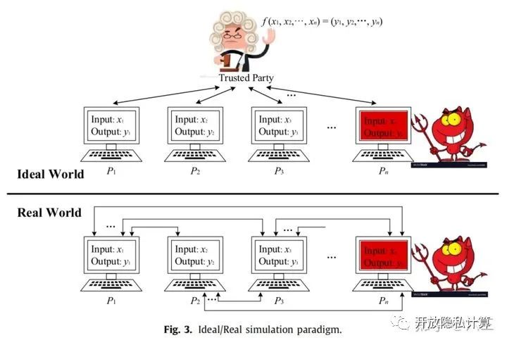 下面给出了更直观的安全定义。协议的安全性可以通过两种联合输出分布的比较来评估:真实世界中的对手和诚实参与者获得的输出分布,以及在理想世界中通过执行获得的输出分布。即,对于针对真实协议执行任何攻击的对手,考虑在理想世界中执行相同攻击的对手,并且如果理想世界中的对手和参与者的联合输入/输出分布与真实世界中的相应分布相同,则满足安全准则。在这种情况下,真实协议的执行“模拟”了理想世界的效果。正如图3所示,其安全性定义称为理想/现实模拟范式。
