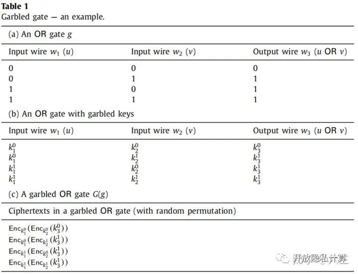为了更好地解释混淆电路的构造,我们首先以或门举例描述如何构建一个简单的混淆门(表1)。或门