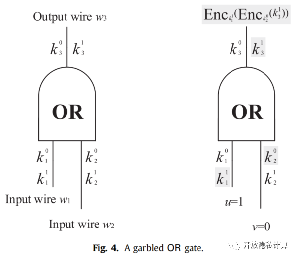 通过将电路门逐层组合,可以直接构造出一个混淆电路。具体地说,由于电路中的前一个门的输出线用作下一个电路门的输入线,因此前一个混淆门输出的混淆密钥也是下一个混淆门的输入的混淆密钥。因此,一旦为每个电路线选择了两个混淆密钥,就可以如上关于混淆或门