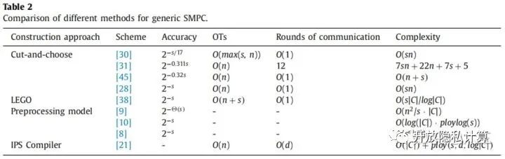 IPS编译器。Goldreich等人基于单向函数,展示了如何将一个针对半诚实敌手的安全计算协议编译成一个针对恶意敌手的安全协议。这种有名的技术被称为GMW编译器。在2008年,Ishai等人提出了一个完全不同的结构,称之为IPS编译器。它利用多方协议进行半诚实敌手的基本操作(在这种情况下大部分是诚实的),并在恶意模型下将诚实多数的多方协议转换为不诚实多数的多方协议。为了计算多方协议,IPS编译器的底层结构是一个工作原理类似于GMW编译器,适用于两方和多方场景的黑盒子。此外,它提供了更好的渐进复杂性,并在非交互上下文中产生了单轮协议。但是,它的常数比预处理模型的常数大,并且在在线阶段不如预处理模型高效。Ishai等人利用IPS编译器研究了有限环上的算术电路在存在恶意敌手的情况下的安全计算。该方法可用于仅执行对环操作和标准密码原语的黑盒调用,并在OT混合模型中实现无条件性。为了确保协议安全性,同时最小化黑盒和通信成本,Lindell等人优化了IPS编译器中的监视列表创建阶段,并提出了,在给定的敌手模型下,使用隐藏安全协议作为实现更高效的渐进安全性的底层组件。此外,Lindell等人分析了IPS编译器的具体效率,并证明在某些情况下它可能是最有效的协议。
