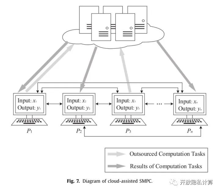 虽然存在多种技术构建通用 SMPC 协议,但是他们目前计算量很大,导致 SMPC 仍然难以实用。为了实现计算效率更高的 SMPC,最近的研究重点是开发用于将最昂贵的计算任务外包给云的安全技术。相对于将云作为一个可信第三方而言,这些外包协议寻求在不泄露任何输入和输出值的情况下使用云计算。通过允许各方安全地将他们的计算外包给云提供商,云辅助 SMPC 提供了一种不同但有效的方法来使通用 SMPC 协议变得实用且可扩展。