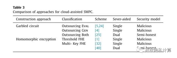 比较。基于 FHE 的云辅助 SMPC 框架比基于混淆电路的框架简单。然而,遵循这种方法的实现的实用性依赖于 FHE 方案的效率,并且不幸的是,如何构造实际的 FHE 方案的问题仍然是一个未解决的问题。然而,如果目标不是为了构建通用协议,对于某些特定的功能,实现只需要某种程度上的同态加密方案,并且仍然可以制定实用的协议。