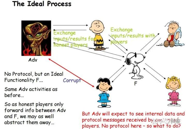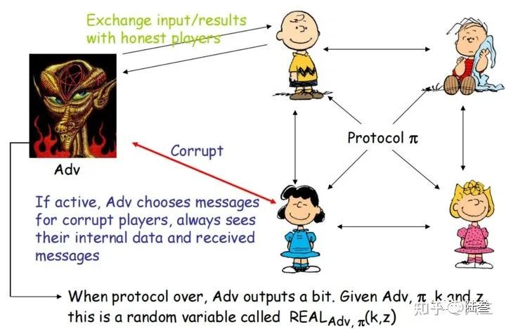 定义前的重要说明:一般情况下,敌手可能会比腐蚀参与方和控制他们的行为更有能力。- 大多数协议都是作为一个更大的系统的一部分来运行的,比如密钥交换协议或电子支付方案。- 现实生活中的敌手会攻击整个系统,而不仅仅是协议。- 因此,敌手可能会对诚实的参与方所提供的输入产生一定的影响,甚至可能控制它们。- 另外,敌手可能会得到一些关于诚实参与方从协议中获得的结果的信息,甚至可能是全部信息。