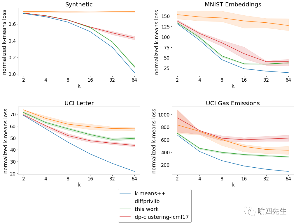 我们分析了归一化的 k-means loss(从数据点到最近中心的均方距离),同时改变了这些基准数据集的目标中心 (k) 的数量。在我们考虑的四个数据集中的三个数据集中,所描述的算法比其他隐私算法的 loss更低。